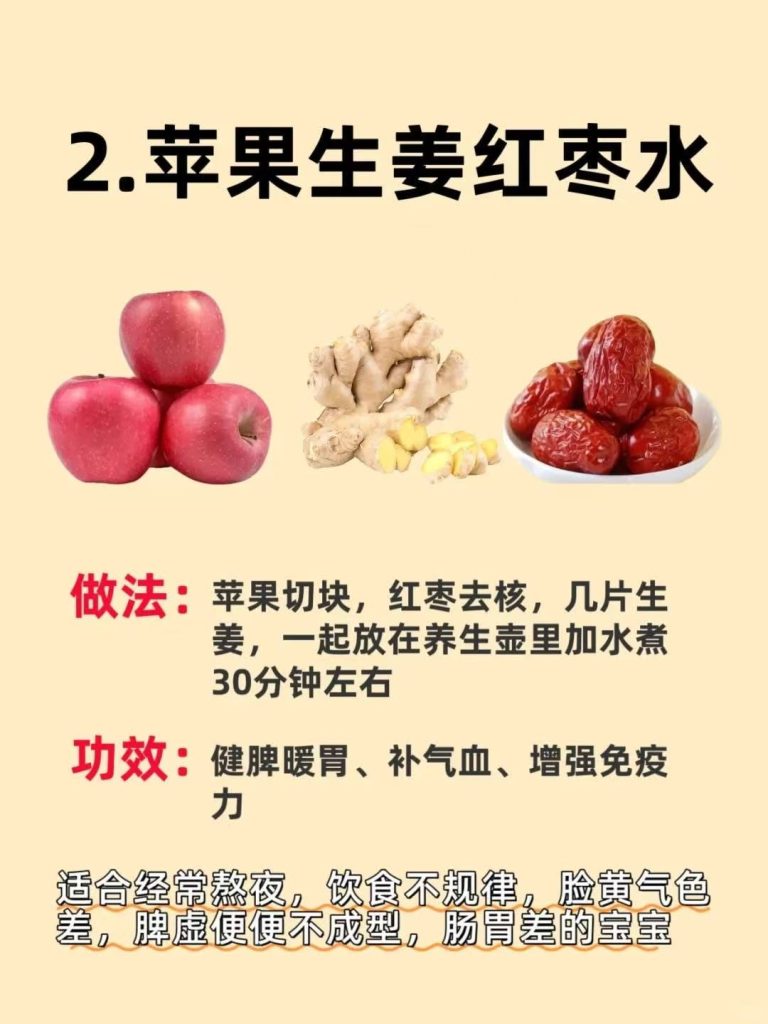 苹果生姜红枣水:适合熬夜、饮食不规律的,脸黄气色差、便便不成形、肠胃差
