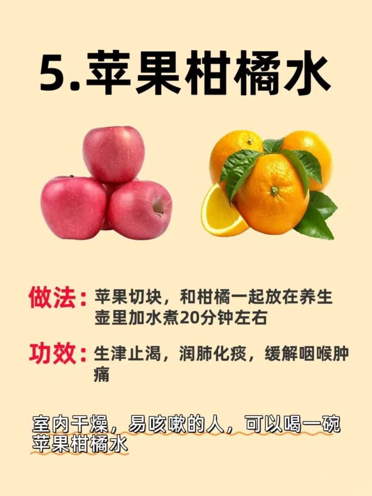 苹果柑橘水:室内干燥,易咳嗽的可以喝